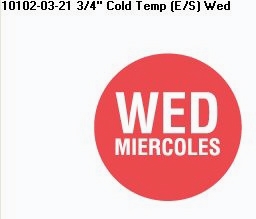 3/4" Cold Temp, Roll of 2000, English/Spanish, Wednesday, Permanent adhesive, Resists moisture build-up, Red BackgRound w/ White Lettersing