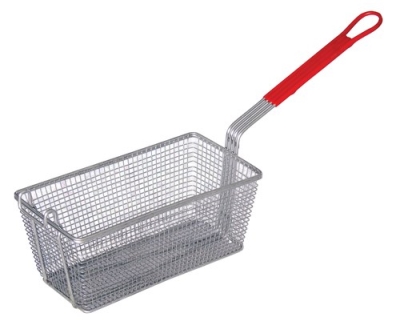 Fry Basket, Rectangular, 12 7/8" x 6 1/2" x 5 3/8", Red Coated Handle, Front Hook, Chrome-Plated Iron Wire
