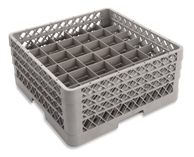 Glass Rack, Full Size, Glass/Stemware, (36) Compartment, w/(2) 36-Compartment Extenders & (1) Open Extender, Compart. Size 2 7/8" Square, Open Bottom & Sidewall, 7 7/8"H Max Inside, Handles on all Sides, Co-Polymer Plastic, Double Wall, Snap-Fit Extender