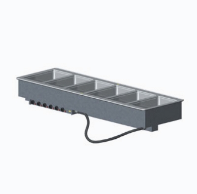 6 Well Hot Modular Drop-In w/Infinite Control, Auto-Fill and Manifold Drains, Drip-Free Flange, Drain Shutoffs,6 3/8" D Wells Operate Moist or Dry, Dial Controls, 1000w Per Well, 208-240v/60/1 ph, 21.6-25 Mode Amps, Nema 6-50p, O/A 81 1/4" x 26"