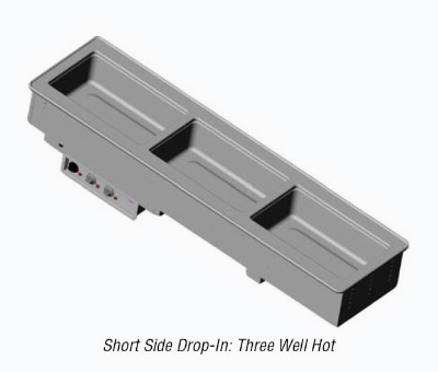 Three-Well Hot Short Sided Drop-In, Infinite Controls, Std Drains, 750-1000w Per Well, 208-240v/60/1 ph, 10.8-12.5a, Nema 6-20p, Turns Full Size Pans Sideways For More Narrow Presentation and Easy Reach, 18-8 S/S