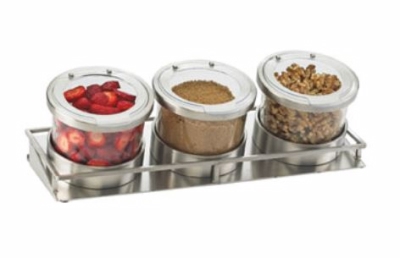 Mixology Jar Display, 13 1/2" W x 5" D x 1 3/4" H, Rectangular Base, S/S, Includes (3) 16 oz Round Jars w/Silicone Lined S/S Lids
